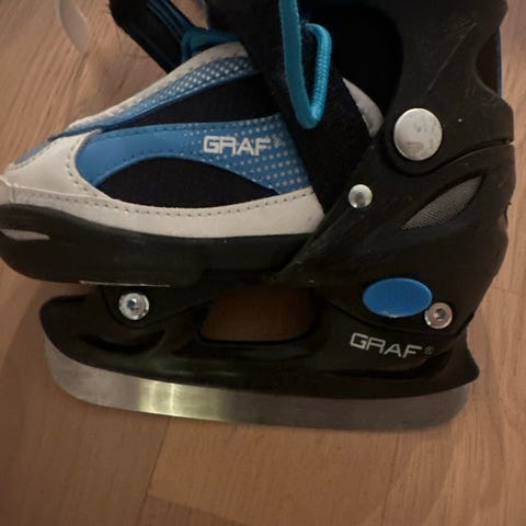 Graf justerbare ishockeyskøyter for barn i størrelse 27. Skøytene er justerbare fra størrelse 27–30, noe som gir mulighet for tilpasning etter fotens lengde. Modellen har kombinasjon av lisser, borrelås og spennelås for god festing rundt foten. Overdelen er i syntetisk materiale med blå, hvite og svarte detaljer. Skøytene har fastmontert skøytestål tilpasset ishockeybruk.