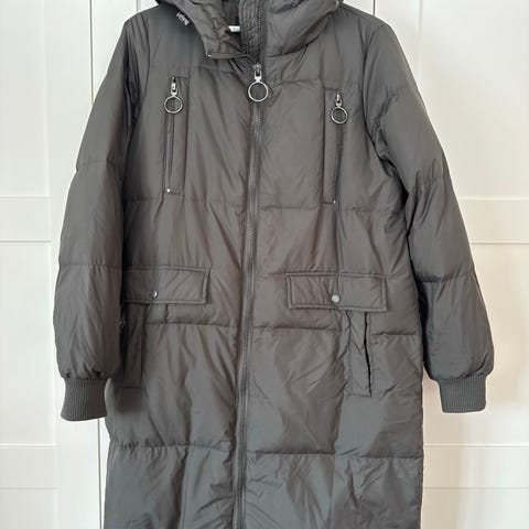 Str M, men den er stor i str så passer str 44 🌺 Lengde 110 cm. Har fast hette, sidelommer, glidelås og trykknapper 😊