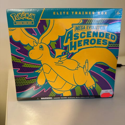 Elite Trainer Box med motiv fra Mega Evolution-serien, Ascended Heroes. Esken inneholder tilbehør til Pokémon Trading Card Game, som kortbeskyttere, terninger, markører og samlekort (innhold kan variere etter utgave). Egnet for spillere og samlere av Pokémon-kort som ønsker en tematisert boks med utstyr til kortspill og oppbevaring.