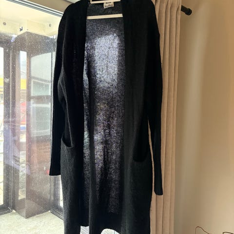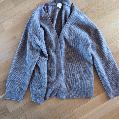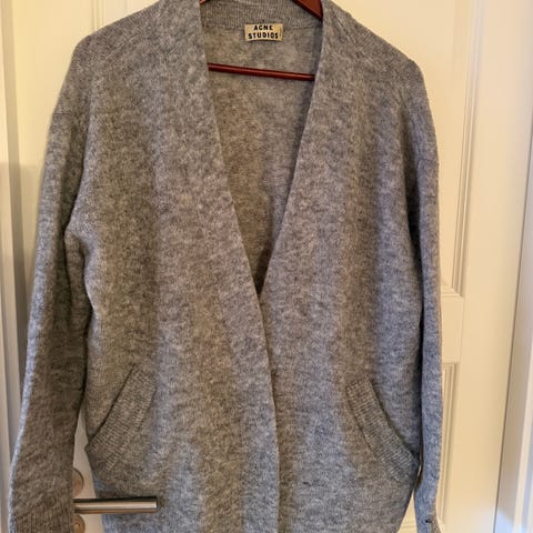 Acne Studios cardigan for dame i størrelse XXS. Merk; stor i størrelsen! Cardiganen er åpen uten knapper eller glidelås, med lange ermer og ribbestrikkede mansjetter. Fargen er rustbrun. Materialet fremstår som en myk, lodden strikkeblanding (se vaskelapp for nøyaktig sammensetning).