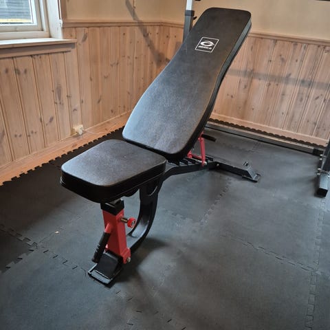 Nesten ikke brukt benk med stang og vekter. Det 20 kg vekter 5 kg per vekt