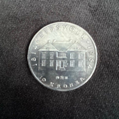 Norges Bank 10 kroner minnemynt med motiv av Eidsvollsbygningen og riksvåpen med krone. Mynten er sølvfarget og har påskriften «1814 Eidsvoll 10» og «Kongeriket Norge». Egner seg som samleobjekt for norske mynter og historiske minnemynter.