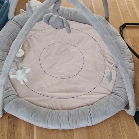 Den grå matten er nyvasket, men lekene bør vaskes. Kan fint vaskes i vaskemaskin.