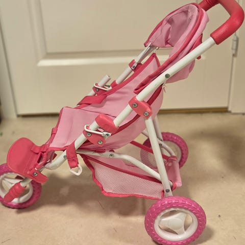 Dukkevogn i tre i rosa farge. Vognen har hvitt håndtak og fire hjul i lyst materiale. På sidene er det blomstermotiv. Passer til lek med dukker og bamser innendørs. Enkel, åpen vognkasse gjør det lett å plassere og ta ut leker. CE-merket.