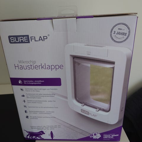 SureFlap Microchip katteluke i hvit plast. Katteluken kan programmeres til å lese kattens mikrochip eller RFID-halsbåndbrikke for å gi tilgang kun til registrerte katter. Egnet for montering i dør, vegg eller andre passende flater ved bruk av riktige monteringsadaptere og eventuelle tunnelforlengere. Drives av batterier (ikke synlig hvilke på bildet). Leveres i original eske med brukerveiledning ifølge emballasjen.