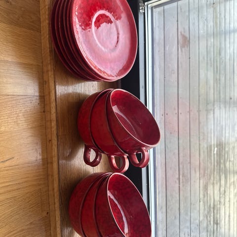 servise i keramikk bestående av kopper med skål og tilhørende tallerkener i matchende oransje farge. Settet inkluderer flere størrelser tallerkener som kan brukes som middagstallerken, lunsjtallerken og asjett, samt underfat til koppene. Passer til servering av kaffe, te, frokost og enkle måltider. Keramisk materiale gjør serviset egnet til daglig bruk på kjøkken eller spisestue.