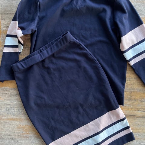 Saint Tropez buksedress for dame i størrelse M. Sett med jakke og bukse i rosa polyester. Jakken har krage, lange ermer og knytebelte i livet. Buksen har rette ben, sidelommer og knytebelte i livet. Passer til bruk som pent eller hverdagsantrekk.