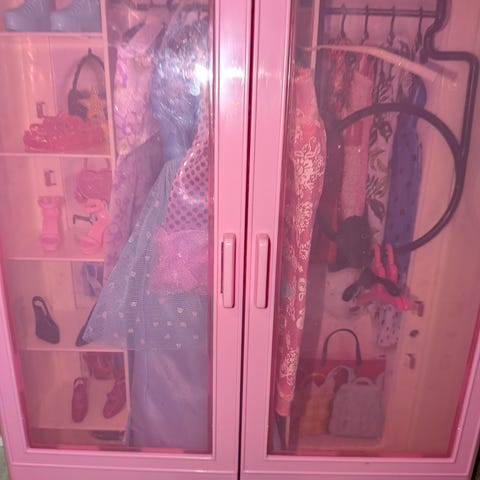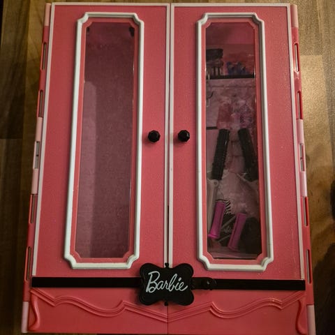 Selger et klesskap til Barbie hvor man kan henge opp klær og sette sko inni. Skapet mangler noen hyller og har gulnet litt på toppen, ellers er det helt og fint. Følger med 4 par sko og to kjoler.