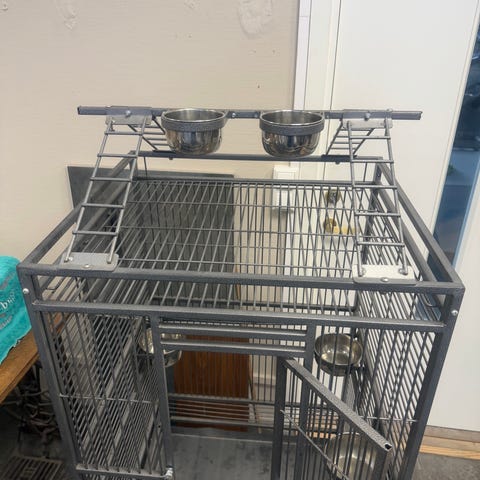 Fuglebur høy modell i metall i grå farge. Buret står på hjul og har flere dører i front for enkel tilgang. Egnet for små til mellomstore fugler. Passer til innendørs bruk og kan innredes med sittepinner, matskåler og leker etter behov. Er skrudd fra hverandre.