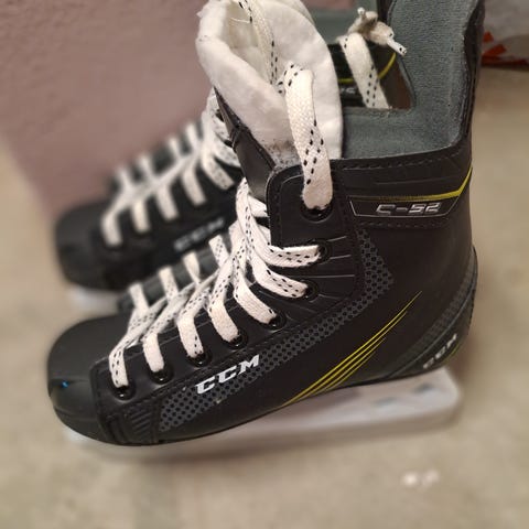 CCM ishockeyskøyter i størrelse 41. Skøytene er i hovedsak svarte med hvite lisser. De har polstret innside og tunge for støtte og komfort rundt ankel og vrist. Egner seg til ishockeyspill og generell bruk på is, for eksempel trening eller fritidsbruk. Passer til personer som bruker skostørrelse 41.