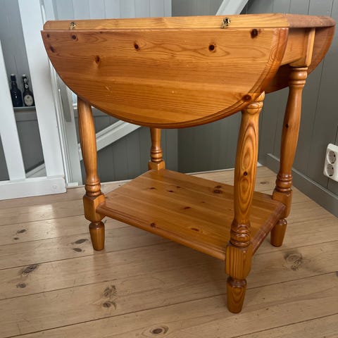 Pent vintage furu klaffebord, med bruksmerker etter mange hyggelige måltider! Pene dreide bordbein, to plater som lett slås opp og ned. Mål: høyde: 75 cm, bredde: 97cm. Midt plate: 49 cm, 1klaff: 59,5cm, bord med 1 klaff oppslått: 105cm, med 2 klaffer oppslått: 164,5cm. Pr nå står bordet på Geilo og må hentes der.