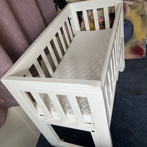Troll bedside crib barneseng i hvit utførelse. Sengen er utformet som en liten sprinkelseng som kan plasseres inntil foreldreseng. Den har mulighet for åpning på én langside og justerbar høyde på understellet for tilpasning til seng. Egnet for spedbarn i den første perioden.