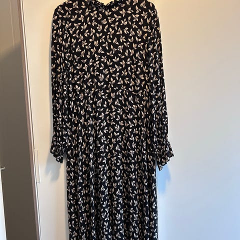 Knelang kjole selges kr 200. Ganske rett i fasongen og lange ermer med strikk. Tynt og lett stoff, med fastsydd underkjole