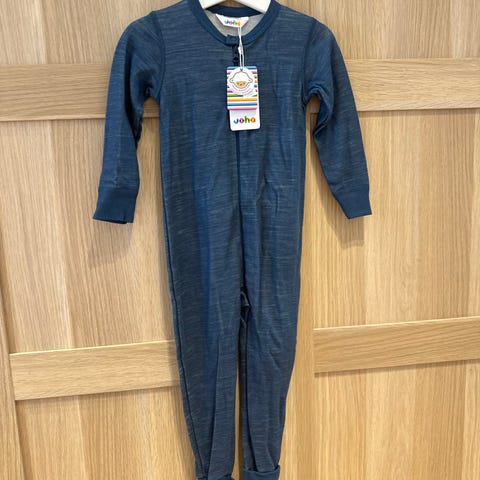 Joha heldress i ull i størrelse 44, unisex. Heldressen er beige/hvit og har ribbestruktur i stoffet. Den har lange ermer og ben, samt trykknapper foran og nedover benet for enkel av- og påkledning. Materialet er ull, som er mykt og egnet som innerste lag for nyfødte. Passer både til jente og gutt.