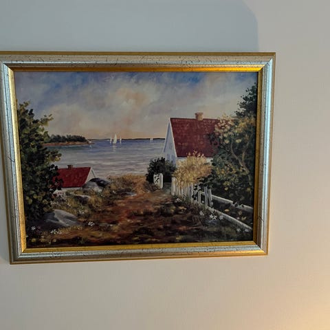 Maleri med maritimt motiv i blå og hvite toner. Bildet viser en terrasse med bord, stol og blomster, samt utsikt mot havet med seilbåt og blå himmel med skyer. I forgrunnen er det en hvit murvegg og en blå dør. Maleriet er innrammet i en gullfarget ramme. Signatur nederst i høyre hjørne, kunstnernavn er ikke tydelig identifisert. Kan sendes med Post Nord kr 69