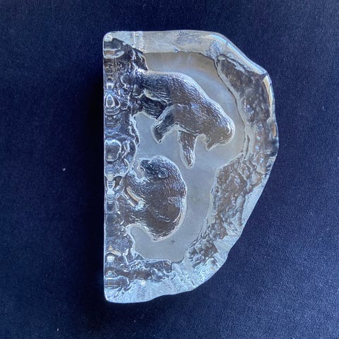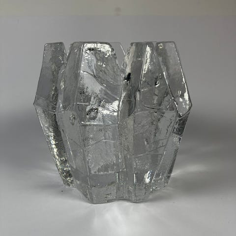 Eda crystall brevholderklart glass med skulpturell, organisk form som " istinnene"har flere oppadgående, søylelignende former som gir et dekorativt uttrykk. Egnet til bruk som kontor pulten eller til pynt..glasskunst fra 1970… 9 cm høy 8 cm bredde