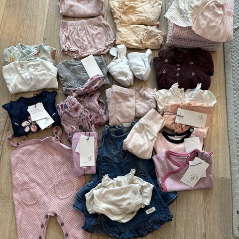 Nydelig klespakke til jente. Inneholder ulike klær fra newbie, H&M, haust and Claire, nameit og lil atelier. 5 sett med body og bukse som hører sammen - samt mange andre bodyer og bukser. 1 nydelig snekker bukse, 2 kjoler og 1 hvit cardigan. Minimalt brukt - ingen spesielle anmerkninger. Helt og fint tøy.