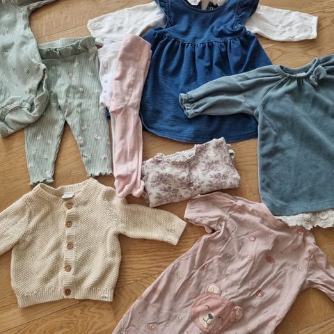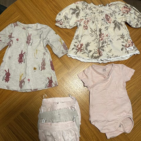 Sommerpakke til jente str 74. Inneholder en rosa sommerpysj og mørkeblå blåmønstret romper og en nydelig cardigan fra Newbie. Den gammelrosa romperen i crepe er fra Huttelihut 🌸