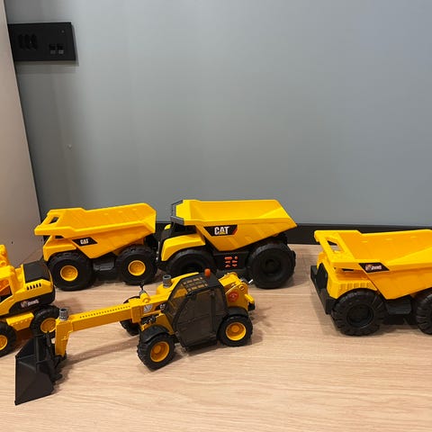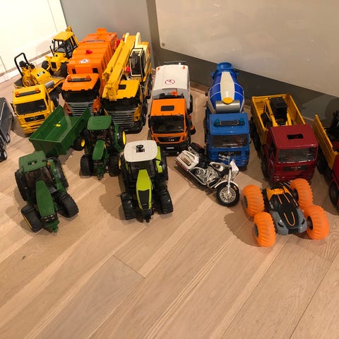 Bruder leketraktorer og landbruksredskaper sett. Inneholder flere traktorer i ulike farger samt ulike tilhengere og redskaper til landbruk, som tilhenger, grave- og lasteutstyr, ploger og andre jordbruksredskaper. Plastmodeller beregnet som leker til barn, med detaljerte kjøretøy og redskaper som kan kombineres med hverandre innen samme skala.