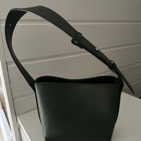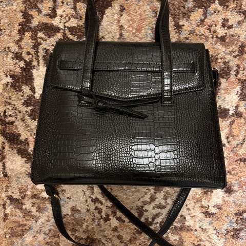 Selger en stor og stilren veske i skinnimitasjon med elegant design og kontrastfargede sømmer. En tidløs modell som passer like fint til jobb som til hverdags og reise. Kun bruk en gang.