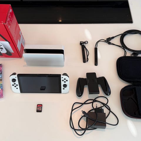 Nintendo Switch OLED spillkonsoll i hvitt med original Joy-Con-kontroller. Medfølgende tilbehør inkluderer dokkingstasjon, strømadapter, HDMI-kabel, to ekstra håndkontrollere (én svart og én lyseblå) samt ladekabler. I tillegg følger det med fysiske spillkassetter med omslag, blant annet titler fra LEGO Star Wars- og The Legend of Zelda-seriene. Konsollen kan brukes både som håndholdt enhet og tilkoblet TV via dokken, og egner seg for én eller flere spillere avhengig av spill og kontrolleroppsett.