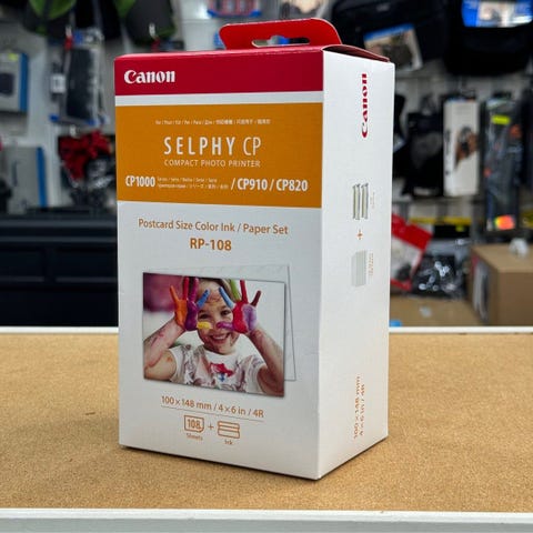 Canon RP-108 fargeblekk og fotopapir sett i postkortstørrelse. Settet inneholder 108 ark fotopapir i format 100 x 148 mm (4 x 6" / 4R) samt tilhørende fargeblekk-kassetter. Egnet for utskrift av bilder i postkortformat på kompatible Canon fotoskrivere.