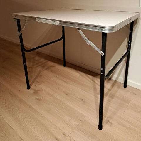 Helt ubrukt Keter kjølebord i plast i hvit og blå farge. Bordet har integrert bøtte/kjølerom med bærehåndtak og rundt bordbrett på toppen. Overdelen kan heves slik at det fungerer som et lite sidebord samtidig som innvendig rom kan brukes til oppbevaring eller kjøling av drikke. Egnet til bruk både inne og ute der man trenger et lite bord kombinert med oppbevaringsløsning.