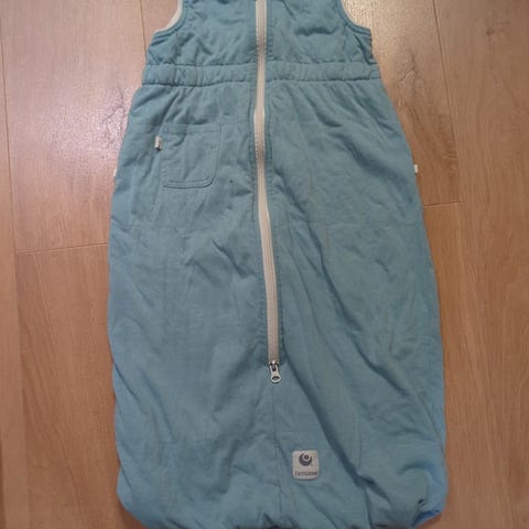 Størrelse 3-18 måneder. Gir en jevn temperatur gjennom hele natten. Tilpasset seler og kan brukes i vogn, bilstol og matstol. To-veis glidelås. Ca lengde 80 cm. Usikker på tog, men tror den er på 2.