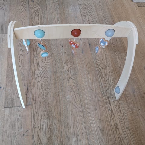 Enkel babygym for spedbarn. Sett babygymmen på et mykt teppe eller lekematte, og legg babyen under gymmen. Den kommer til å se på de fargerike hengelekene, strekke seg etter dem og på den måten trene syn, motorikk og hånd-øye-koordinasjon.