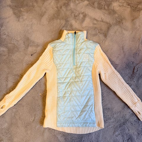 Dæhlie isblå ullgenser for barn i størrelse 140. Genseren er i creme ull med lang rygg og høy hals med glidelås i front. Modellen har vattert panel i front og på skuldre i lyseblå kontrastfarge, samt ribbestrikkede ermer og sider. Unisex-passform som egner seg som mellomlag eller innerste lag til ulike uteaktiviteter.