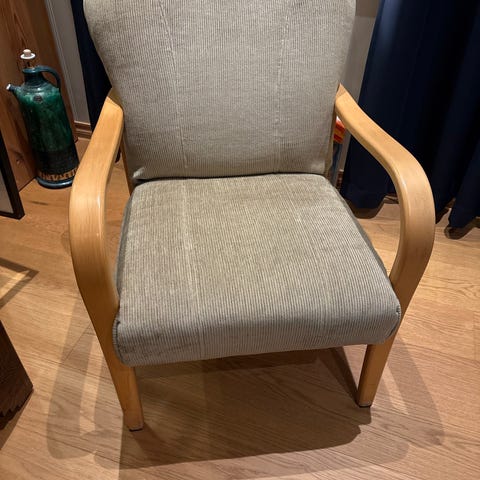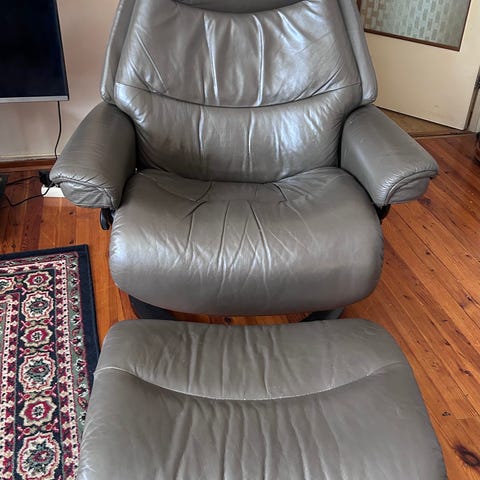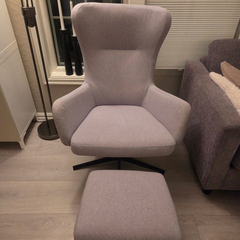 Lenestol med krakk, grå i stoff, i fin stand, selges samlet for 800kr.