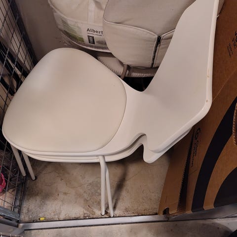 Stolene er stabile og kan brukes som de er, men har en del bruksmerker, slitasje og avskalling i lakken (se bilder). Passer fint som ekstra stoler, til hytte, studentbolig eller for den som ønsker å pusse dem opp.