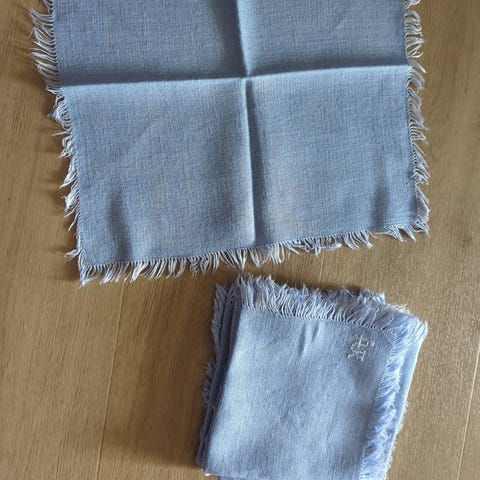 En hvit duk brodert med grønt, 85x85 cm og 4 servietter, 29x29 cm. Maskinbrodert. Selges høystbydende over kr 60