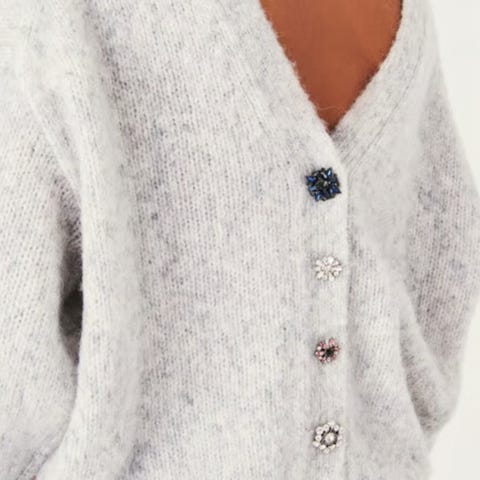 Marie Stone Knit Cardigan fra Neo Noir. Søt strikket cardigan fra Neo Noir. Marie Stone Knit Cardigan har rund hals, cropped lengde og lange ermer. Cardiganen har rimini-stener rundt halsen og dekorative knapper i front