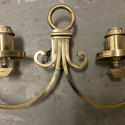 Vakker vintage vegglampe i messing med et ovalt speil og innebygd lysestake.
