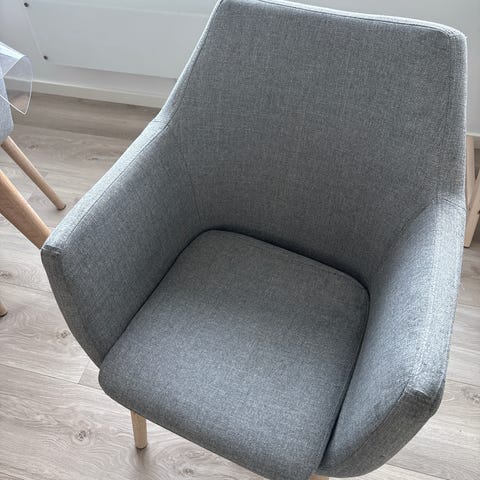 Skandiform lenestol i grått tekstiltrekk. Stolen har heltrukket sete og rygg med integrert nakkedel, samt avrundede former som gir god sitteflate. Understell med fire ben i tre. Passer som lenestol i stue, lesehjørne, kontor eller venterom. Nøytral gråfarge som gjør den enkel å kombinere med annet interiør.