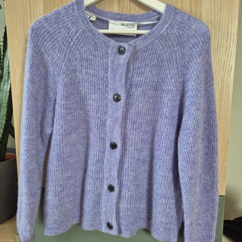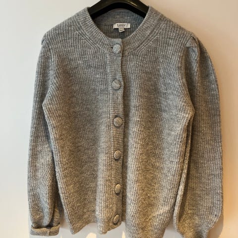 Denne typen materiale blir raskt litt «nuppete» i strikken. Den er brukt, men fortsatt i bra stand. Pris settes lavt pga at den er litt «nuppete»