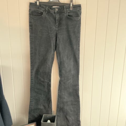 H&M Divided bukse for dame i svart farge. Buksen er i bomullsmiks og oppgis i størrelse 40 med livvidde W30. Modellen har beltehemper, knapp og glidelåslukking foran samt lommedetaljer med klaff og knapp foran. Rett til lett utsvingt ben. Egner seg til hverdagsbruk og kan kombineres med ulike topper og jakker. Low waist flere bukse.