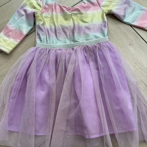 KappAhl kjole for jente i størrelse 98. Kjolen er rosa med hvit overdel og har flere lag med skjørt, inkludert et ytterlag i tynt, transparent stoff som gir volum. Materialet er hovedsakelig polyester. Tynne skulderstropper og mykt fôr på innsiden. Egnet som penkjole til barn i ca. størrelse 98.
