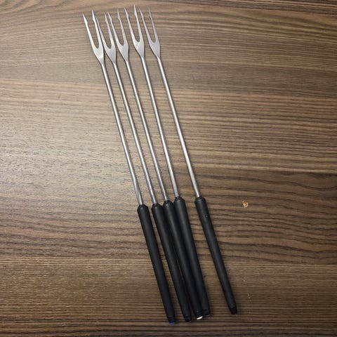 Fondue gafler i teak i original eske. Produsert i Sveits