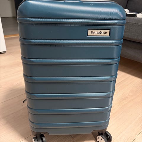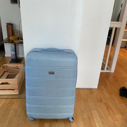 Ingen flekker innvendig, grei koffert som selges rimelig. Mellomstor størrelse, kodelås virker ikke