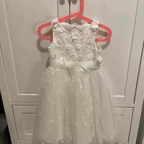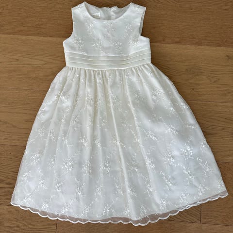 H&M kjole for jente i størrelse 98. Kjolen er hvit og laget i polyester. Modellen er ermeløs med glatt overdel og utsvingt skjørt med lag på lag og blomsterbrodert tyll ytterst. Den har sløyfedetalj bak i livet. Passer som penkjole til ulike anledninger. Materiale ifølge vaskelapp er polyester, med fôr for økt komfort. Vaskes etter anvisning på plagget.