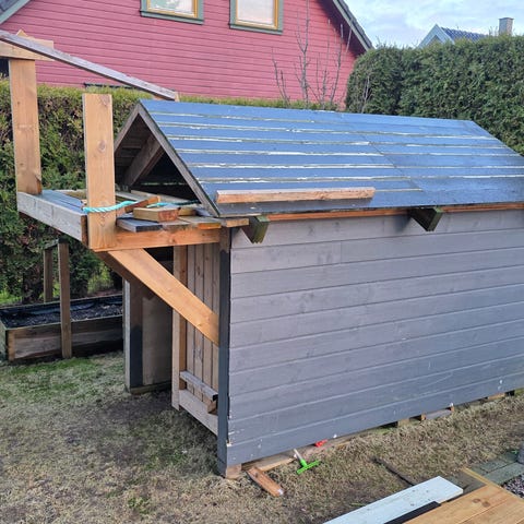 Lekehus i tre med liten overbygd veranda og skråtak. Huset har vindu på siden og rekkverk rundt verandaen. Taket er tekket med takshingel, og veggene er kledd med liggende panel. Fint å bruke som redskapsbod/ hønshus også.