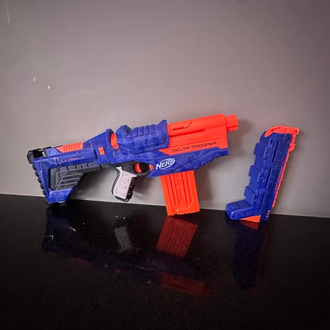 Nerf leker våpensett med flere plastblastere, piler og to magasiner på ulik størrelse