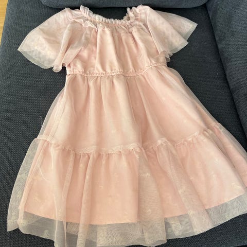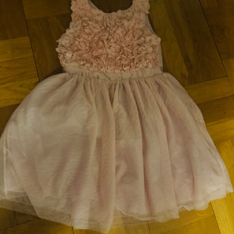 H&M kjole for jente i størrelse 98. Kjolen er rosa og laget i polyester. Overdelen har dekorative blomsterdetaljer, og skjørtet er lagdelt med tyll for et voluminøst uttrykk. Lukkes med knapper bak. Egner seg til bruk i selskap og andre anledninger der man ønsker en pen kjole til barn.