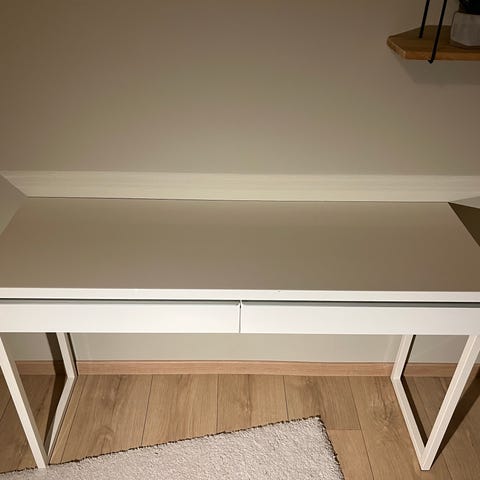 Jysk skrivebord i hvit utførelse. Bordet har to skuffer i front. Understellet består av enkle ben i metallfarge som gir god plass til stol og bein under bordplaten. Egnet som arbeidsbord, hjemmekontorplass eller skrivebord på soverom og stue. Overflaten er glatt med noen synlige merker på bordplaten og på skuff.