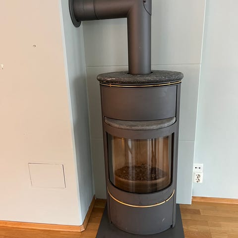 Vedovn med stor buet glassfront og toppplate i kleberstein. Ovnen har rund form og røykuttak på toppen. Glassdøren gir godt innsyn til flammene, og klebersteinen på toppen kan bidra til å holde på varmen over tid. Passer som varmekilde i stue eller andre oppholdsrom der det er tilrettelagt for vedfyring og pipe/røykkanal. Farge fremstår som mørk grå/sort metall.