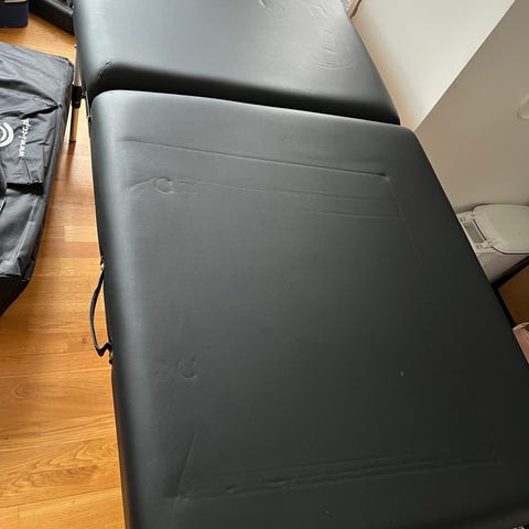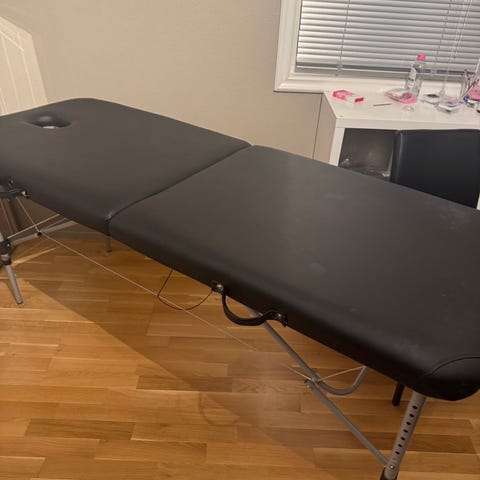 I-COUCOU massasjebenk i sammenleggbar utførelse. Benken har polstret liggeflate trukket i svart kunstskinn og sammenleggbart understell i tre. Praktiske bærehåndtak på sidene gjør den egnet for mobil bruk. Passer til massasje, behandling og annen kroppspleie hvor det er behov for en stabil og komfortabel benk. Lengde 185cm bredde 75cm, tykk behagelig madrass. Kommer med bæreveske. Må hentes for stor for sending.