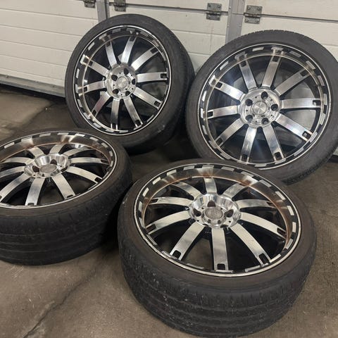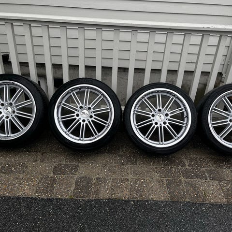 Selger et sett tøffe Vertini felger med ok sommerdekk ca 5 mm mønsterdybde igjen. Selges da bilen de stod på skal selges. 2 stk Minerva og 2 stk Infinity dekk.