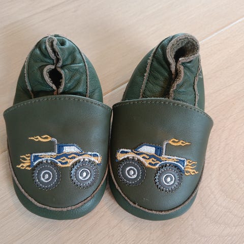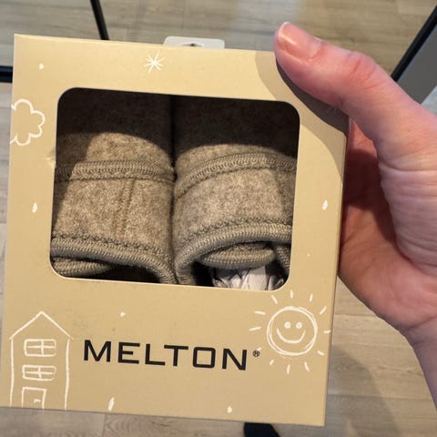Melton babytøfler størrelse 20-21. Kun prøvd på, men var allerede for små da vi fikk de til jul.